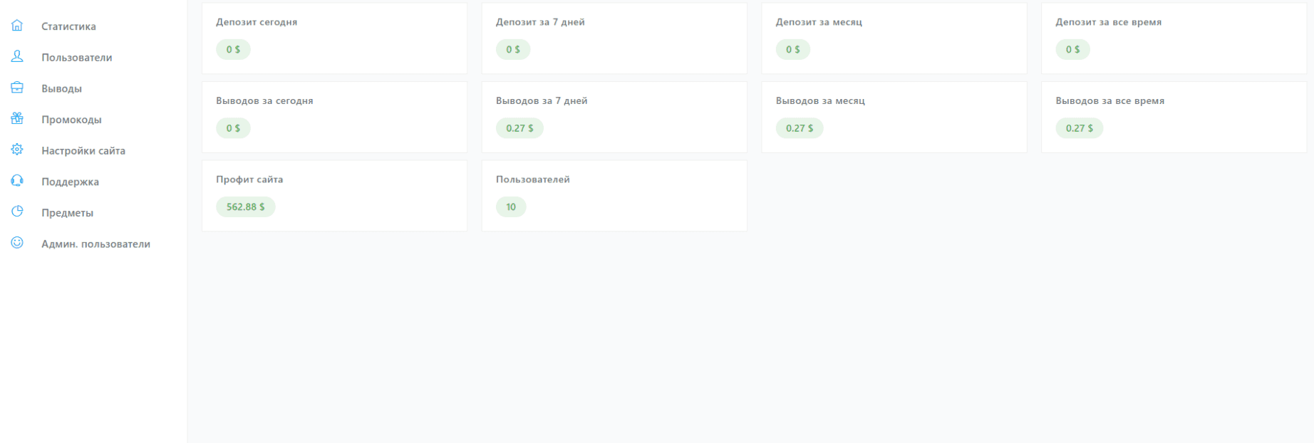 Фейк боты и гибкая настройка в админ панеле. Есть возможность настроить на профит сайта, регулировать анти минус, контролировать экономику. Отдельная тех.поддержка на сайте через запросы в тикете, обменник скинов без заддержки.