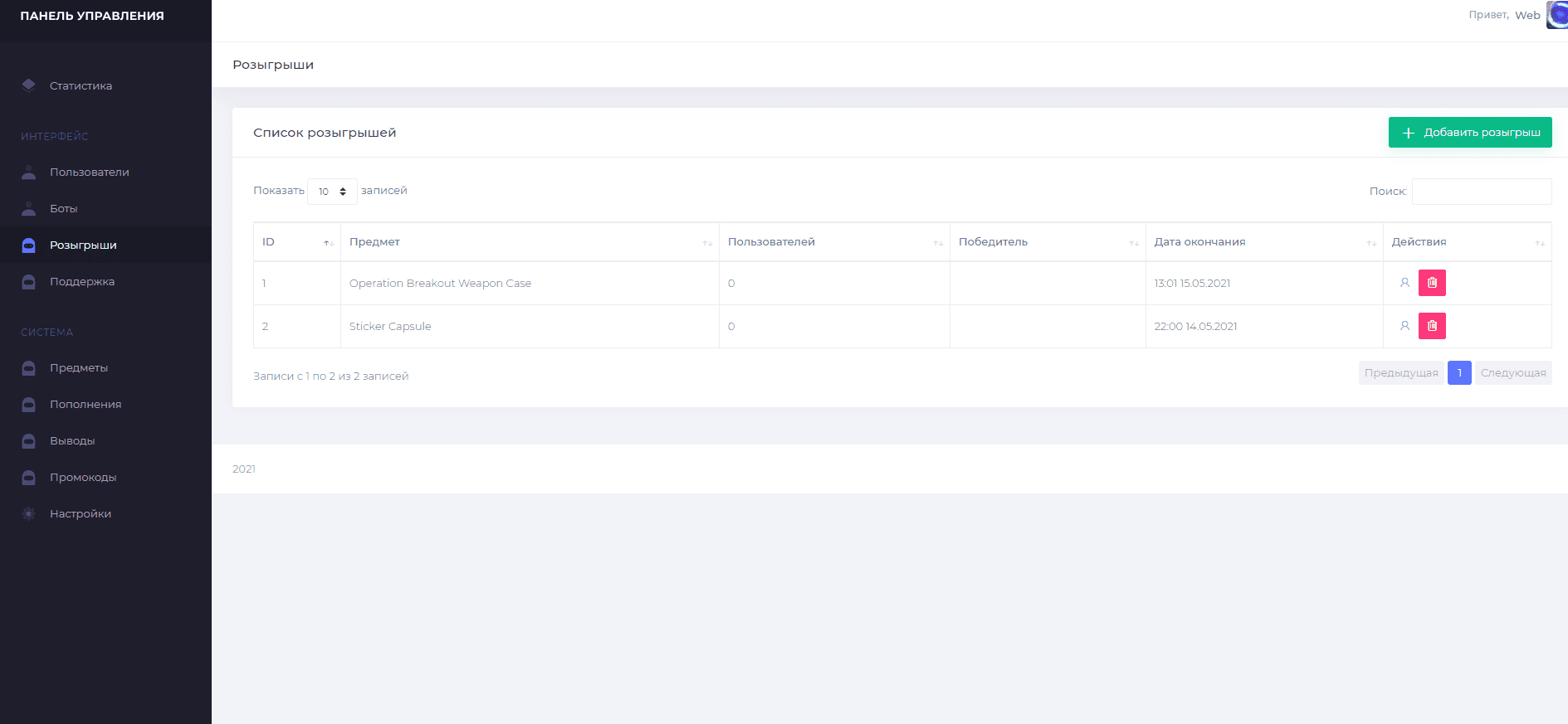 Подкрутка, настройка, розыгрыши, фейк боты, предметы и добавление предметов, пополнения, выводы в лайв времени, промокоды, реферальная система, настройка ботов(гибкая), настройка краш с экономикой, остановка сайта или запуск тех работ, настройка оплаты Юнитпэй,SkinsBack, настройка соц сетей, настройка выводов для игроков(ограничения, лимиты, блокировка)