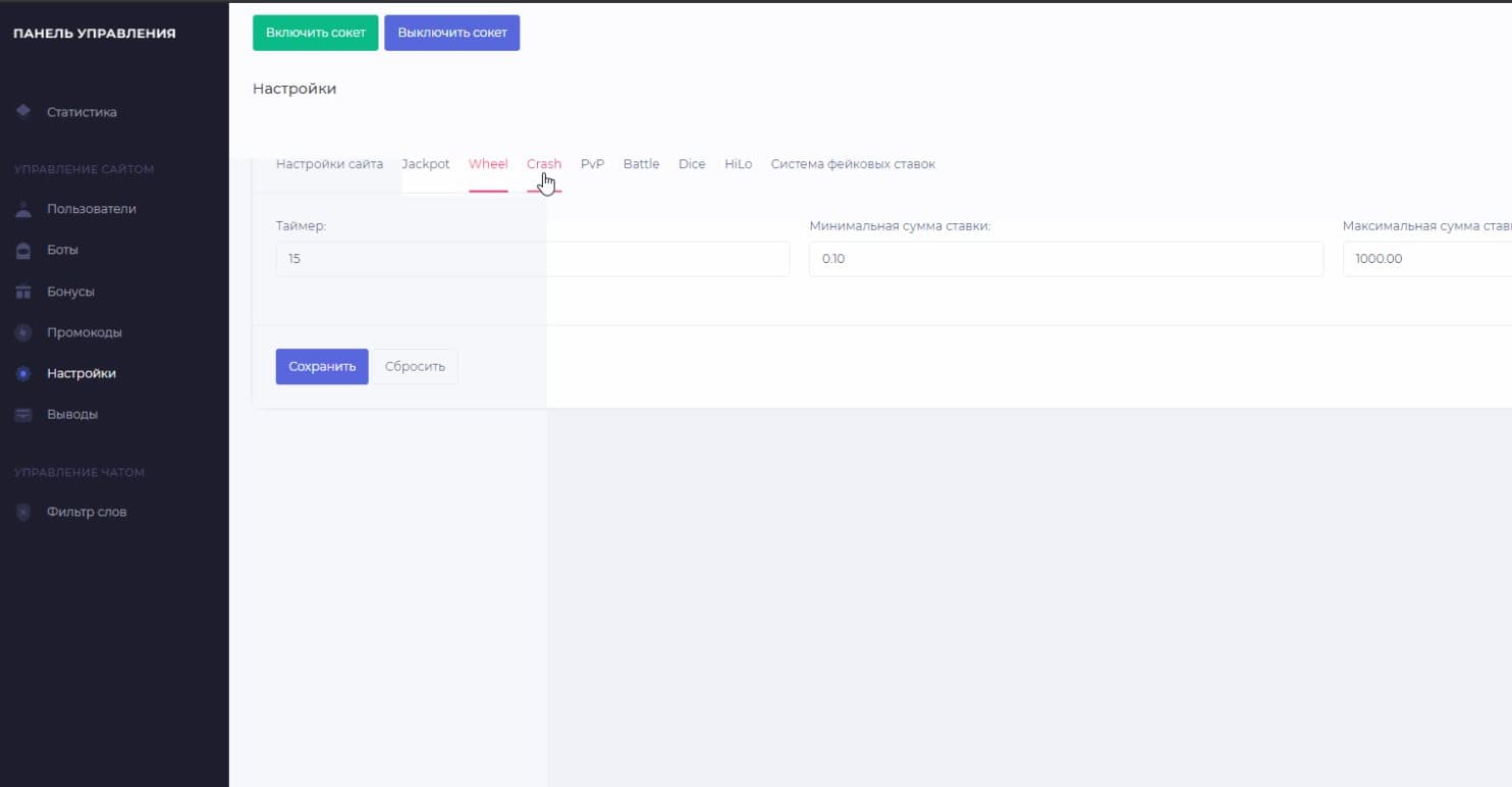 - Промокоды - возможность создания, количество и сумма монет, так же выбор на бонусный счет или реальный