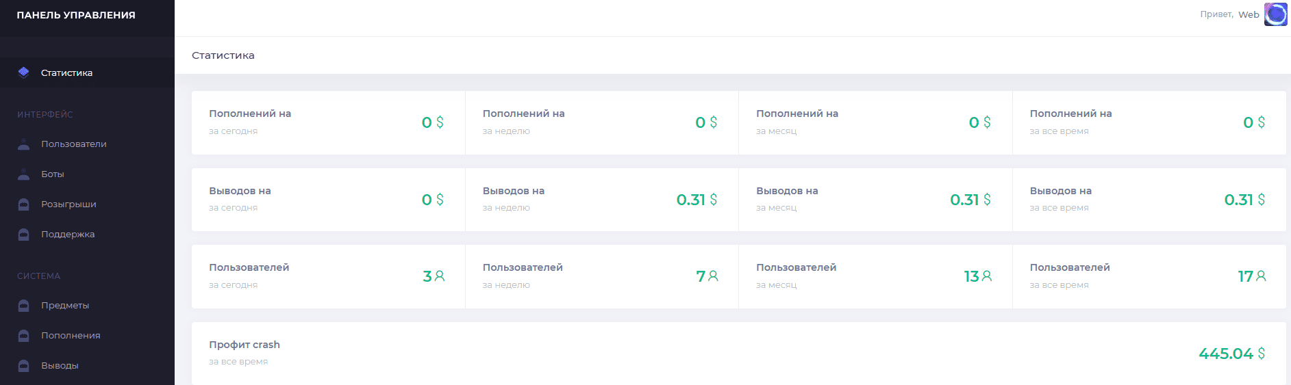 Подкрутка, настройка, розыгрыши, фейк боты, предметы и добавление предметов, пополнения, выводы в лайв времени, промокоды, реферальная система, настройка ботов(гибкая), настройка краш с экономикой, остановка сайта или запуск тех работ, настройка оплаты Юнитпэй,SkinsBack, настройка соц сетей, настройка выводов для игроков(ограничения, лимиты, блокировка)