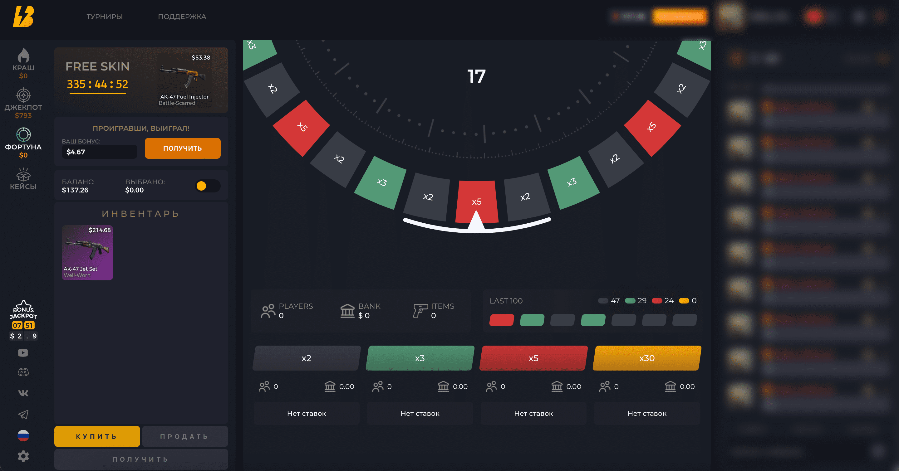 Турниры - Создается Турнир на указанное время (час, неделя, месяц) Любой игрок выполнивши условия ( мин. деп ) может участвовать в турнире и зарабатывать турнирные очки ( очки начисляются с выигрышной ставки от 1.41х, к примеру ставка 1$ на 2х = 2 турнирных очка )