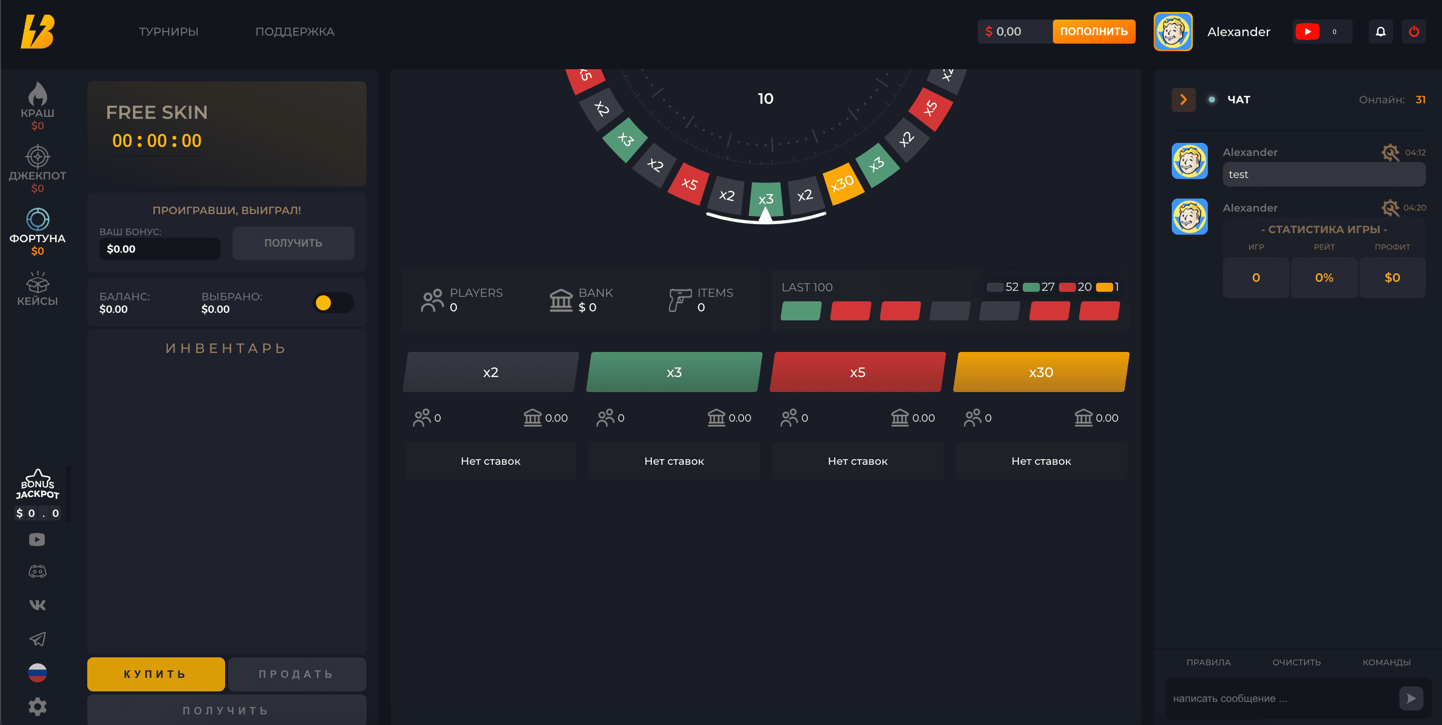 Free Skin - Игрок выполнивши условия ( название сайта в нике, мин деп, количество ставок в режиме краш) становится участником. По окончания таймера рандомно выбирается один победитель.